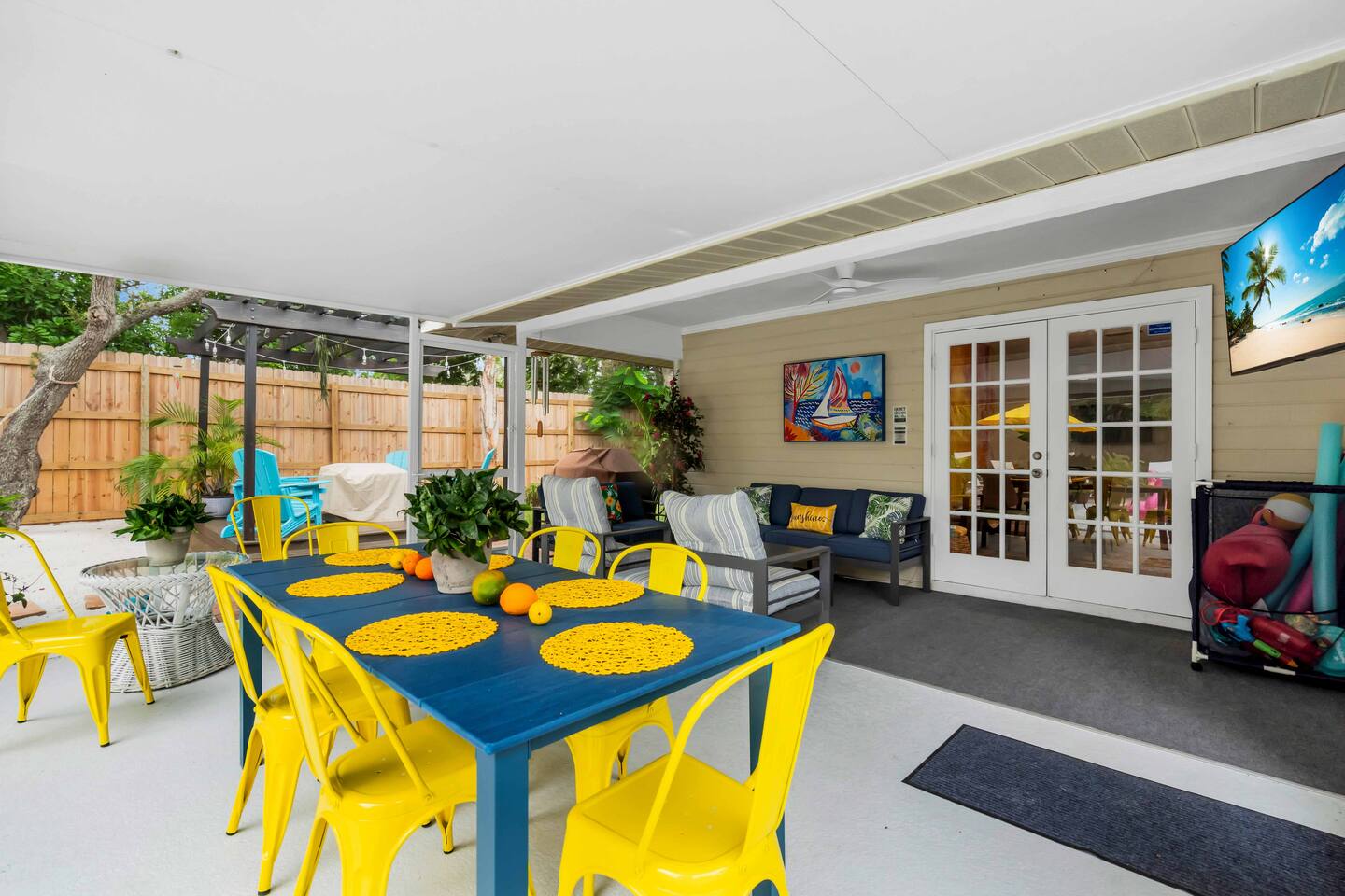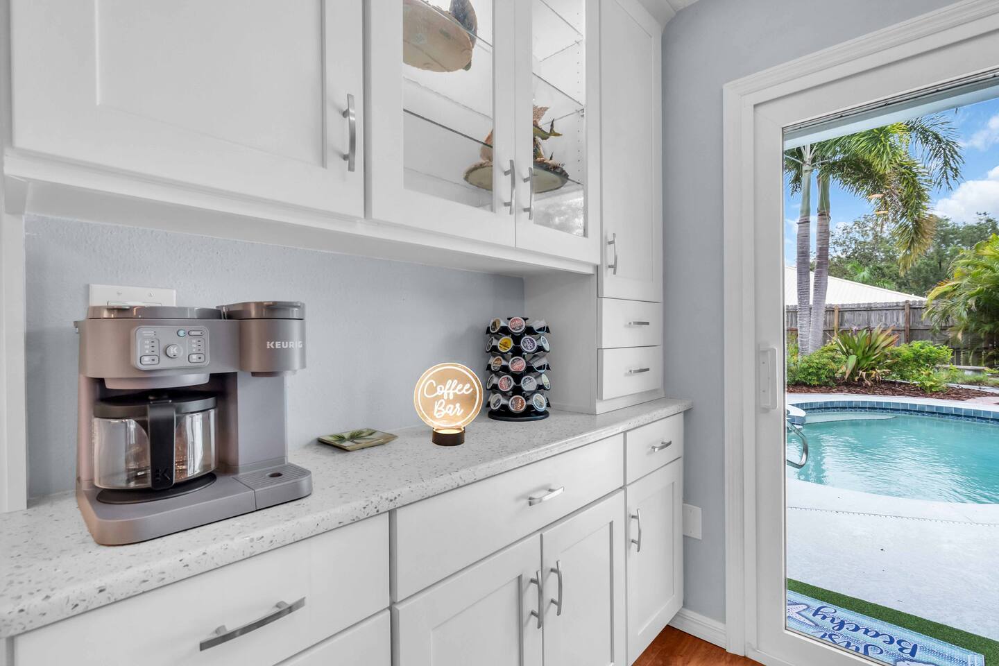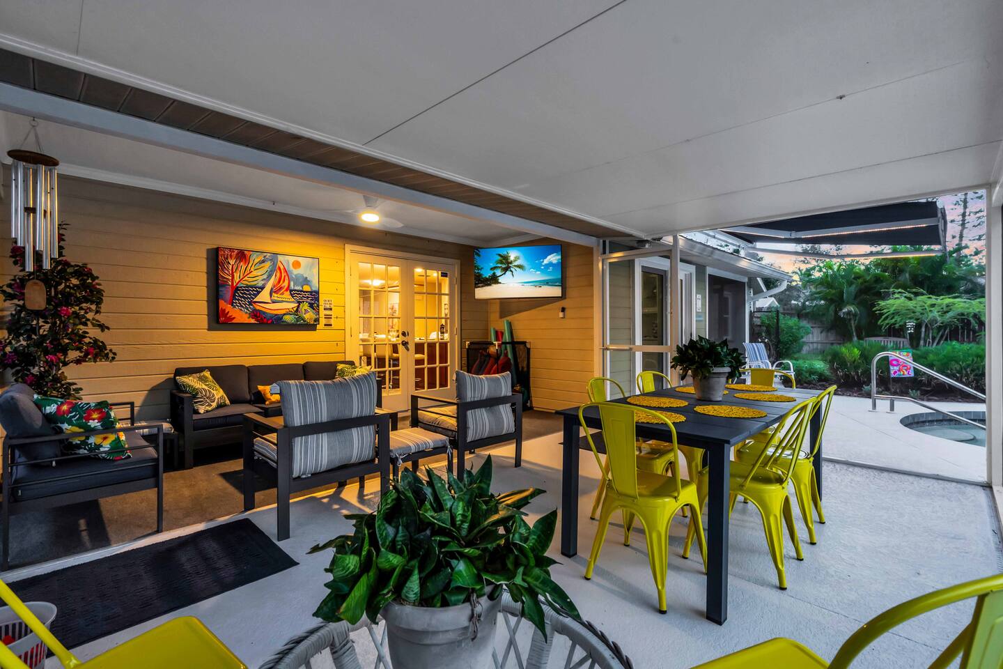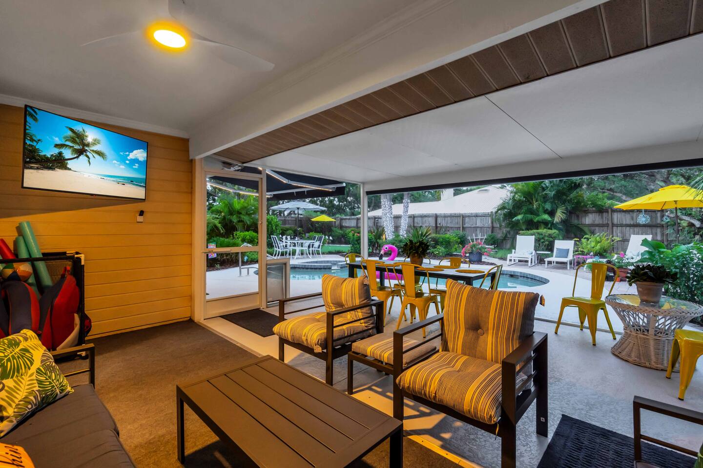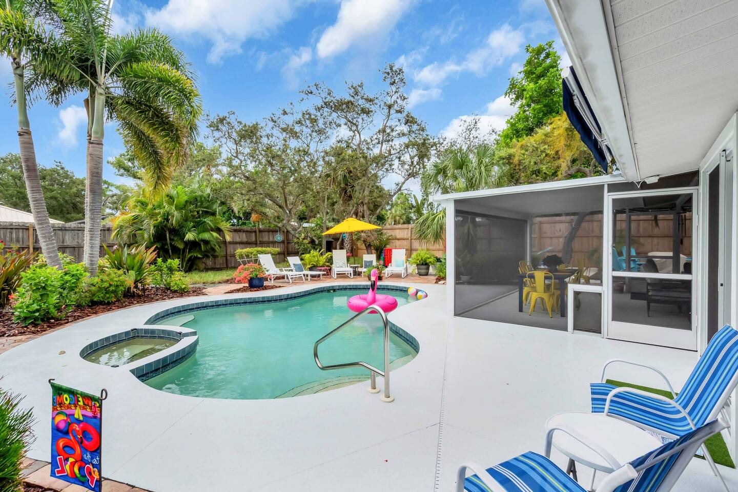 Check-in: 4:00 PM | Check-out: 10:00 AM House Rules: No smoking, and please respect quiet hours from 10 PM – 7 AM. Trash & Recycling: Trash is collected Monday & Thursday mornings. Recycling is picked up Thursday, and yard waste on Wednesday. Please place bins curbside by 6 AM on collection days. Pool & Hot Tub: Professionally maintained twice weekly Tuesday and Friday. Please shower before use and never leave children unattended. Do note these days as the pool cleaner will enter the backyard on these days. Yard maintenance is a must in this beautiful tropical climate year-round. Our landscaper will enter the backyard on Saturdays to tidy the area during your stay and make it wonderful for you. Smart TV Use: All 7 Roku TVs are set up for Guest Mode so you can log in with your own streaming accounts and automatically sign out at checkout. Outdoor Shower: A private shower with hot and cold water is available near the pool area. Family-Friendly: Highchair and Pack ’n Play provided. Games & Entertainment: Please enjoy arcade games, foosball, ping pong, mini golf, and yard games responsibly. Return items to their place after use. Our home is treated quarterly by a professional pest company. You may spot harmless lizards or other Florida critters—just let us know if anything needs attention, and we’ll have our pest team take care of it. The washer and dryer room is interior way down the hall with no door, so you might hear a little noise when in use, but the units are high-end and quiet. We do our best to keep everything in perfect condition for you. Please treat the home with care so future guests can enjoy the same wonderful experience.