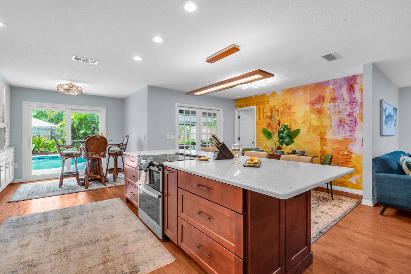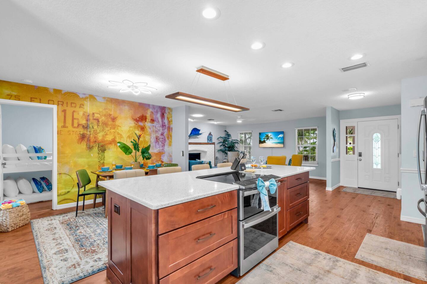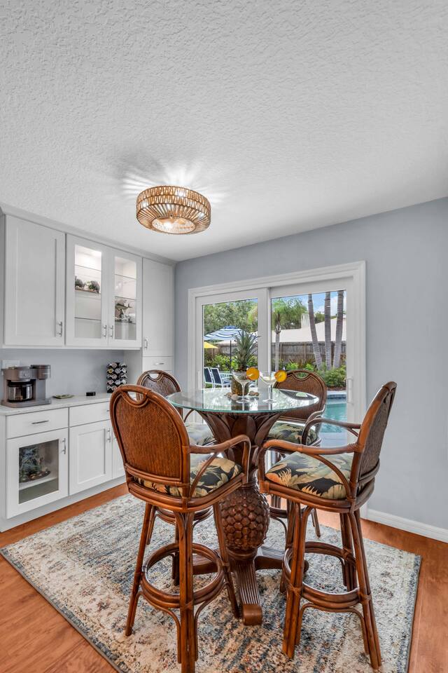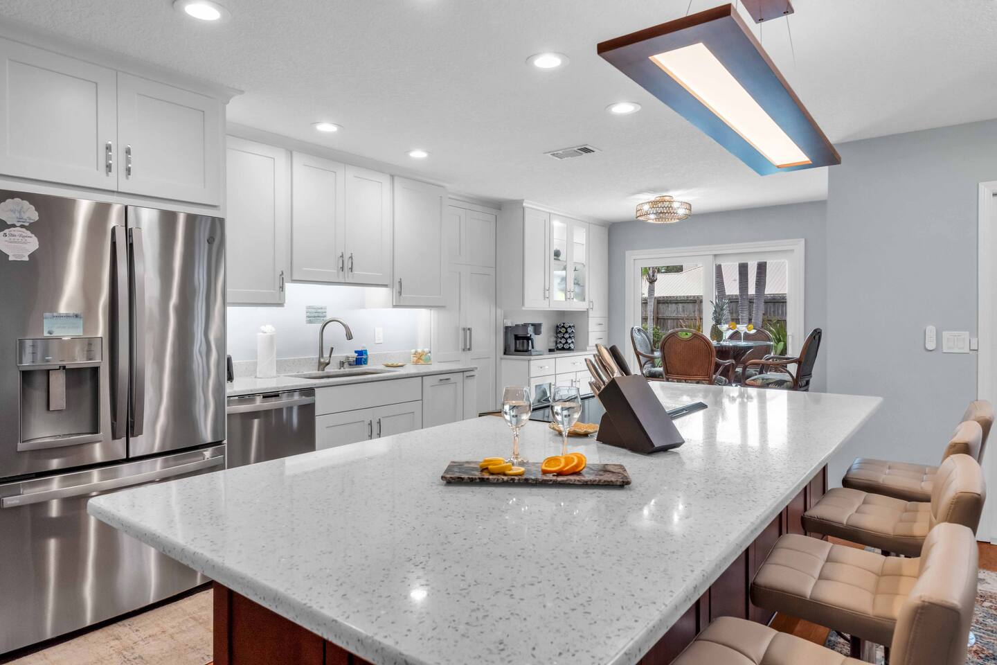 Check-in: 4:00 PM | Check-out: 10:00 AM House Rules: No smoking, and please respect quiet hours from 10 PM – 7 AM. Trash & Recycling: Trash is collected Monday & Thursday mornings. Recycling is picked up Thursday, and yard waste on Wednesday. Please place bins curbside by 6 AM on collection days. Pool & Hot Tub: Professionally maintained twice weekly Tuesday and Friday. Please shower before use and never leave children unattended. Do note these days as the pool cleaner will enter the backyard on these days. Yard maintenance is a must in this beautiful tropical climate year-round. Our landscaper will enter the backyard on Saturdays to tidy the area during your stay and make it wonderful for you. Smart TV Use: All 7 Roku TVs are set up for Guest Mode so you can log in with your own streaming accounts and automatically sign out at checkout. Outdoor Shower: A private shower with hot and cold water is available near the pool area. Family-Friendly: Highchair and Pack ’n Play provided. Games & Entertainment: Please enjoy arcade games, foosball, ping pong, mini golf, and yard games responsibly. Return items to their place after use. Our home is treated quarterly by a professional pest company. You may spot harmless lizards or other Florida critters—just let us know if anything needs attention, and we’ll have our pest team take care of it. The washer and dryer room is interior way down the hall with no door, so you might hear a little noise when in use, but the units are high-end and quiet. We do our best to keep everything in perfect condition for you. Please treat the home with care so future guests can enjoy the same wonderful experience.