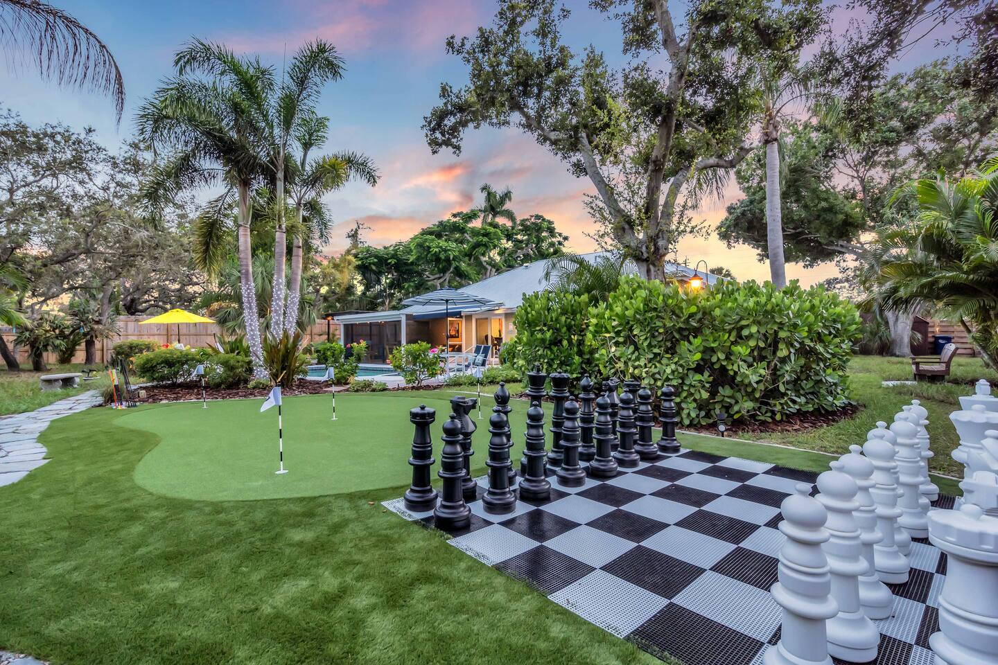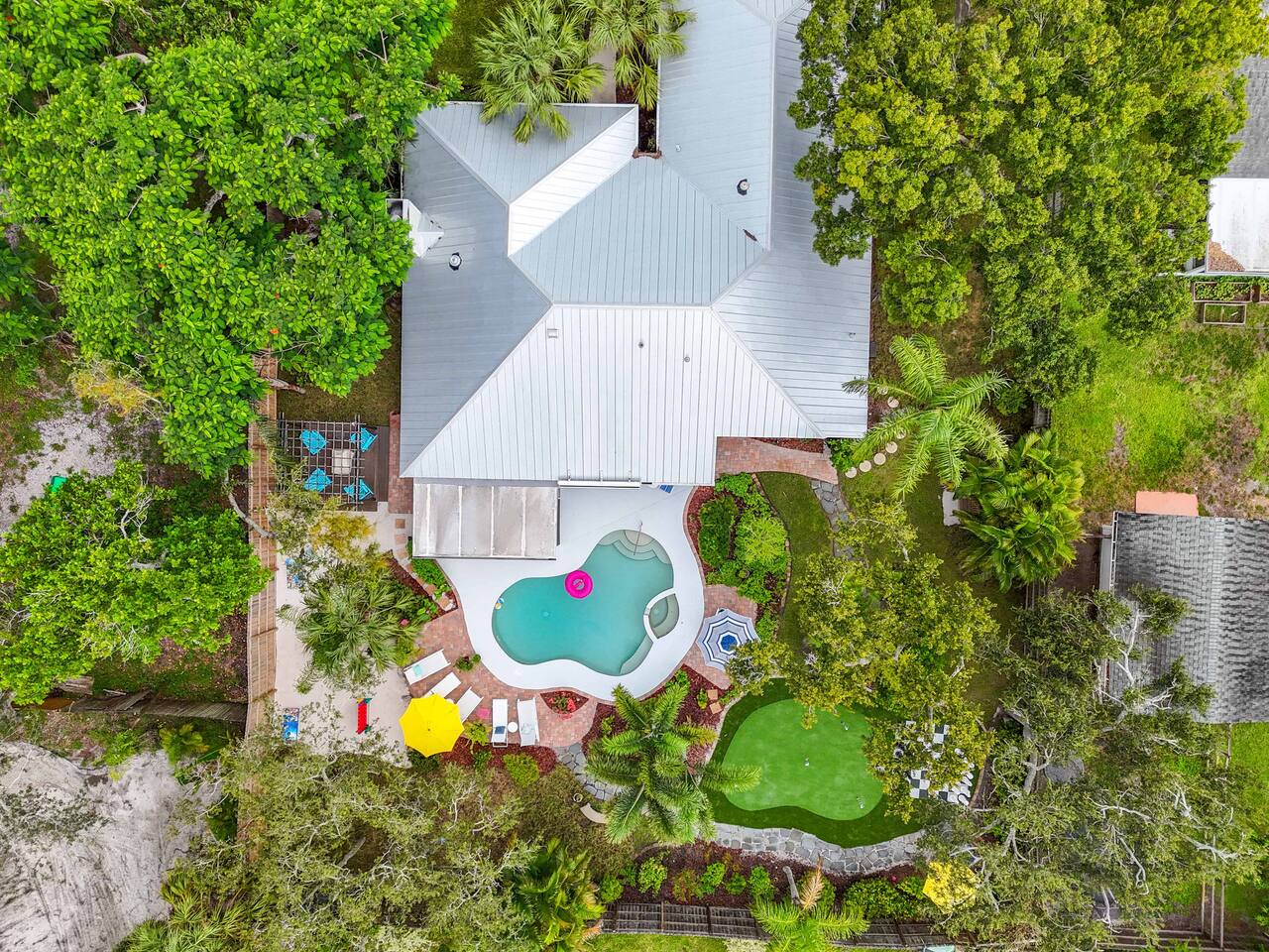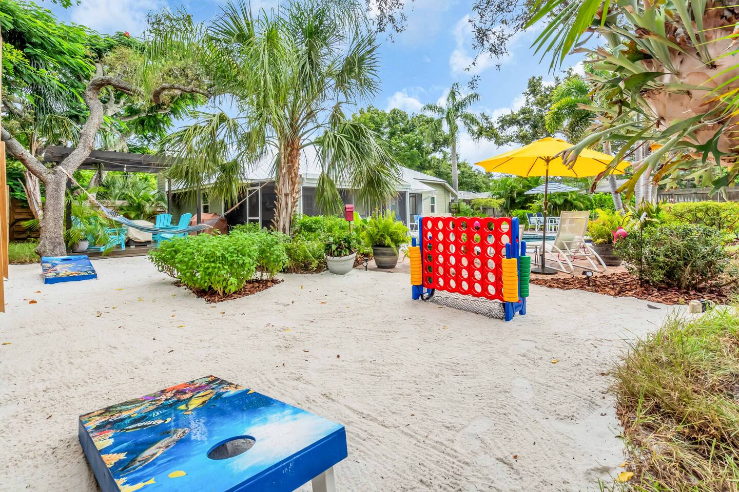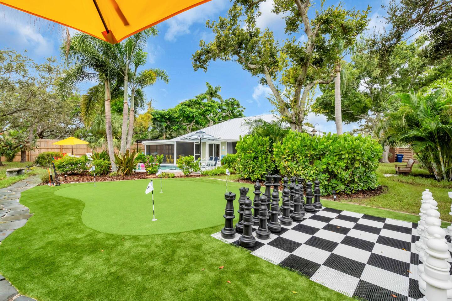 Guests will have full private access to the entire home and outdoor spaces during their stay, including: The whole house – 4 bedrooms, 2 bathrooms, living areas, fully equipped kitchen, and laundry room. Private pool & attached spa – fully screened lanai with outdoor dining and lounge seating. Tropical backyard oasis – mini golf, giant chess, cornhole, giant Connect Four, pergola with fire pit, grill, and garden walkways. Game zones – arcade machines, foosball, ping pong, and lounge game area. Outdoor shower with hot & cold water. Driveway parking for multiple vehicles 6+. Entry is simple with a smart lock and personalized code provided before arrival. No shared spaces — the home and property are exclusively yours to enjoy.