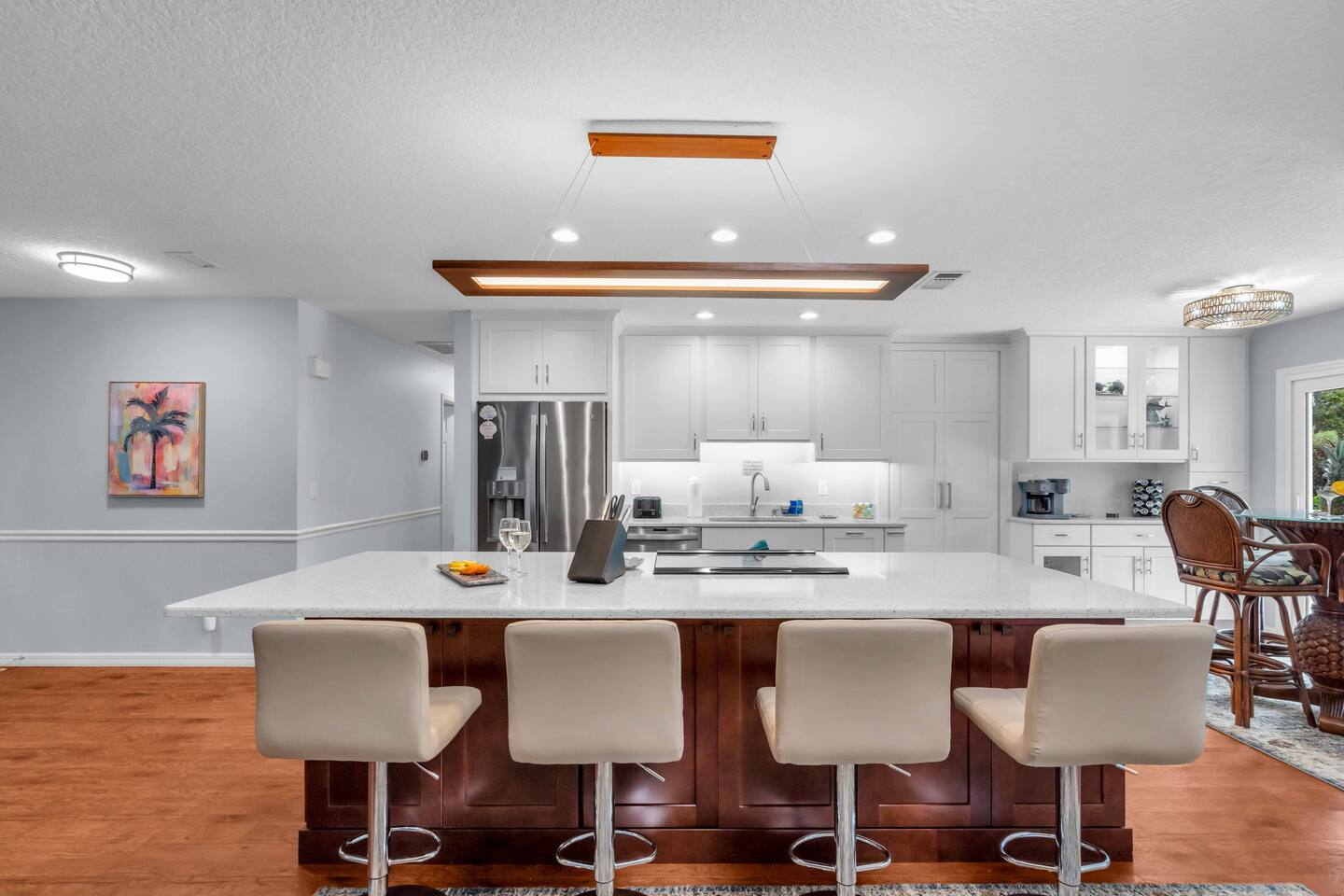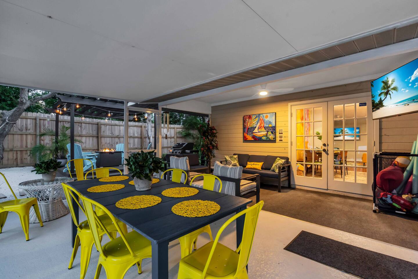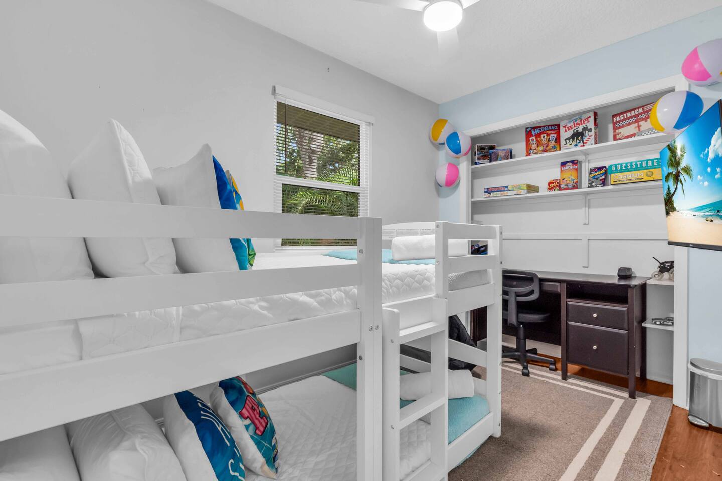 Destiny Palms – Your Private Bradenton Oasis Welcome to Destiny Palms, a spacious and charming retreat where vacation meets relaxation. Tucked away in a quiet very nice neighborhood just minutes from Anna Maria Island and IMG Academy, this 4-bedroom, 2-bath pool home comfortably hosts up to 12 guests. Whether you’re planning a family getaway, a beach escape with friends, or a sports trip, Destiny Palms offers the perfect mix of comfort, fun, and convenience. Where You’ll Sleep Bedroom 1: 1 King Bed Bedroom 2: 1 Queen Bed Bedroom 3: 1 Queen Bed Bedroom 4: 1 Twin Bunk Bed (2 beds) Game Room: 1 Full Futon + 1 Queen Bed Total: 4 Bedrooms • 6 Beds • Sleeps 12 Step into your private paradise: Resort-style backyard with pool and spillover spa, outdoor shower, pergola with fire pit, Weber grill, and tropical garden pathways. Entertainment for everyone – giant chess, mini golf, ping pong, foosball, arcade games (Ms. Pac-Man including 60+ games + Mortal Kombat). A retro gaming zone with board games. Fully conditioned space (Heat and A/C). Plenty of space to relax – multiple lounge areas, screened lanai dining for 8, poolside dining for 4, poolside seating, front porch rocking chairs, and a private screened patio off the primary suite. Fully equipped kitchen w/Air Fryer built-in to the oven + coffee bar, high-speed fiber internet, and 7 Roku TVs for the ultimate convenience. Refrigerator with Ice and Water in door. French Door w/bottom freezer. Family-friendly touches – highchair, Pack ’n Play, and beach gear (chairs, towels, umbrella, cart). From sunrise coffee on the porch to evening drinks by the fire pit, Destiny Palms is designed to make every moment of your stay unforgettable.